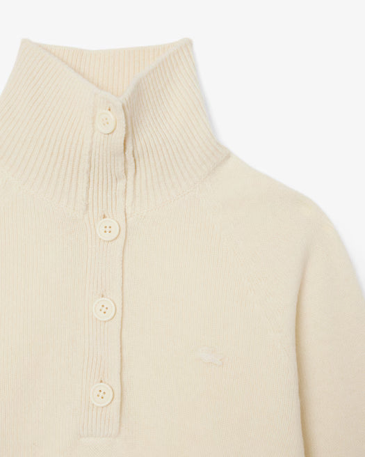 Questo maglione è il top dell'eleganza e del design all'avanguardia di Lacoste. Realizzato in lana cardata pesante e soffice, con tecnologia di maglia 3D all'avanguardia per un risultato senza cuciture che sfiora le tue curve per un look estremamente femminile. Un capo sofisticato, con collo alto con bottoni e discreti dettagli arrotolati.